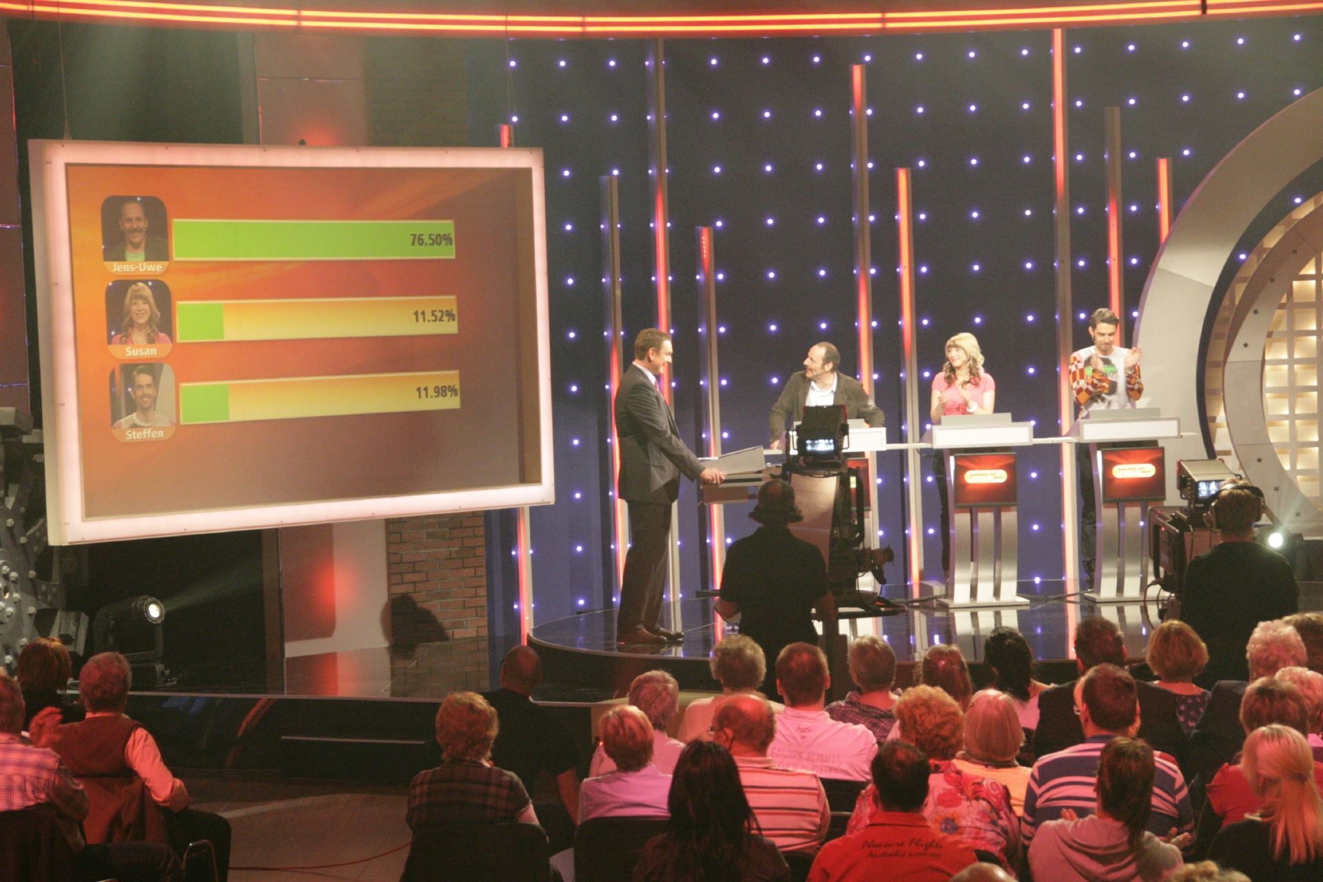 Liefern & Aufbau der Gameshow Technik für Kandidaten und Moderator sowie des dazugehörigen Regiebereichs. Softwareprogrammierung von vier Einzel-Game-Shows, mit einer zentralen Punkteverwaltung. Abbildung der Spielmasken sowie Auswertung von Interaktionen auf den Touch Monitoren der Kandidaten. Bespielung der Frontscreens auf Regieanweisung (Sendungslogo, Logins, Antworten, Punkte etc.) Zusätzliche Ausgaben der Sendemasken als Key & Fill Signal. Implementierung von aktionsbezogenen Sound in unsere Software. Liefern von 250 Votinggeräten für das Studiopublikum und Auswertung der Eingaben in unserer Software.